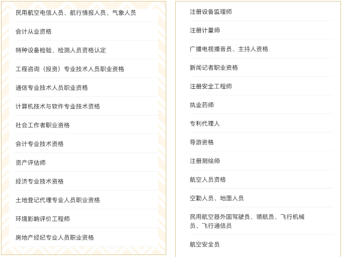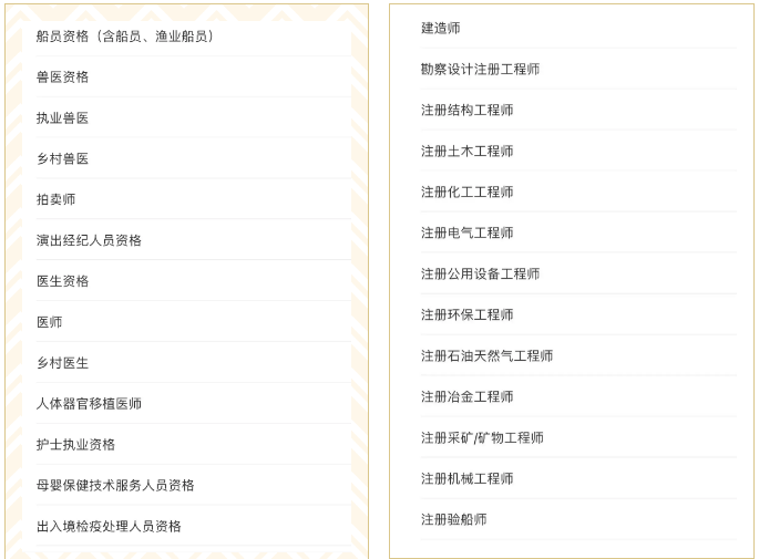 技(jì)能(néng)人(rén)員(yuán)職業(yè)資格中包÷ε<含焊工(gōng)、電(diàn)工(gōng)、鍋爐操作(zuò<σ)工(gōng)等。 專業(yè)技(jì)術(shù)人(rén)員(yuán)職業(yè∞α )資格包括教師(shī)資格證、法律職業(yè)資格證、醫(yī)生(shēn®¶♣g)資格證、新聞記者職業(yè)資格證、導遊資格證等。